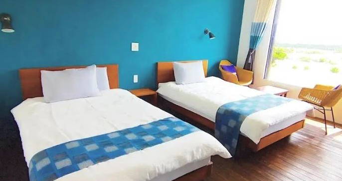 またたびやは、カラフルなインテリアと大きな窓から見えるのんびりとした島らしい風景を堪能できるホテルです。